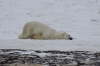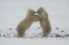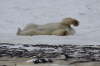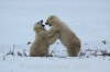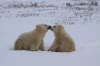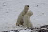 Erst erhebt sich der linke der beiden gewaltigen Tiere, streckt und reckt sich ausgiebig. Er stößt seinen verschlafenen Kumpel mit der Nase an, der jedoch keine Lust verspürt, sich von seinem gemütlichen Fleck im Schnee zu erheben. „Dann eben nicht“, scheint der erste zu denken, „ich kann mich auch alleine beschäftigen.“ Mit Kopf und Brust auf dem Boden, beginnt er seinen massigen Körper genüßlich über das Eis und durch den Schnee zu schieben, wälzt sich anschließend auf dem Rücken in dem eiskalten Weiß, die Beine in alle Richtungen von sich streckend. Endlich scheint der zweite auch beeindruckt zu sein von soviel Bewegungsdrang, kommt ebenfalls auf seine gewaltig großen Tatzen, mit denen man als Mensch keine nähere Bekanntschaft machen möchte. Die beiden stehen sich gegenüber und richten sich plötzlich nacheinander auf die Hintertatzen zu ihrer beeindruckenden Größe von zweieinhalb bis drei Metern auf. Ein Raunen geht durch unseren Tundra Buggy. Dann werden wir Zeuge eines Play-fights, eines spielerischen Kampfes, in dem sich die beiden auf den späteren Ernst des Lebens vorbereiten, wenn sie auf dem offenen Eis mit anderen Eisbären um ihre lebensnotwendige Beute, die Robben, kämpfen müssen. Auch hier können wir am Ende des Play-fightings ein paar Blutspuren im gelblich weißen Fell der Bären erkennen. Aber die beiden liegen wenig später wieder friedlich nebeneinander im kühlenden Schnee, lassen sich auch nicht stören, als ein dritter Bär hinzukommt und sich neben ihnen für ein Nickerchen niederläßt.